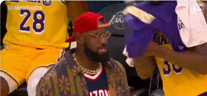 虽然因为伤病无法出战,但是勒布朗仍然不停和场上的队友交流,积极互动。